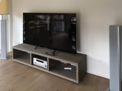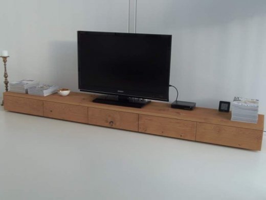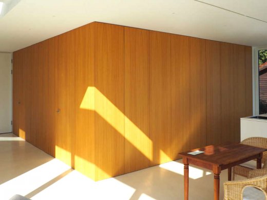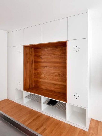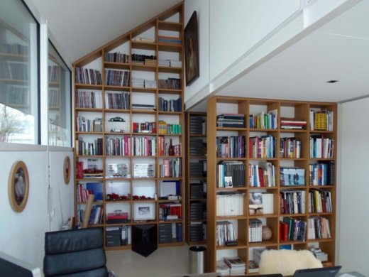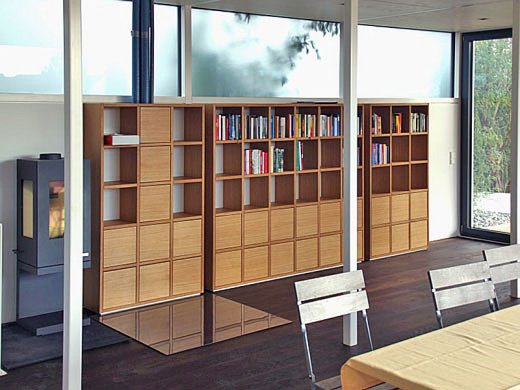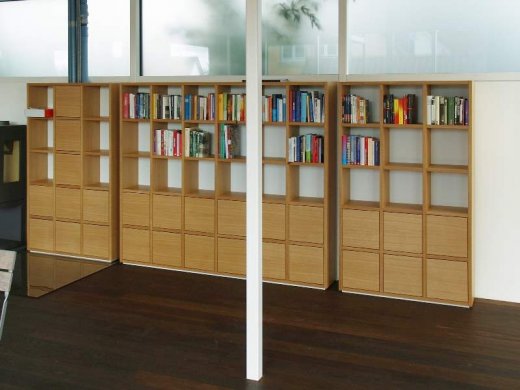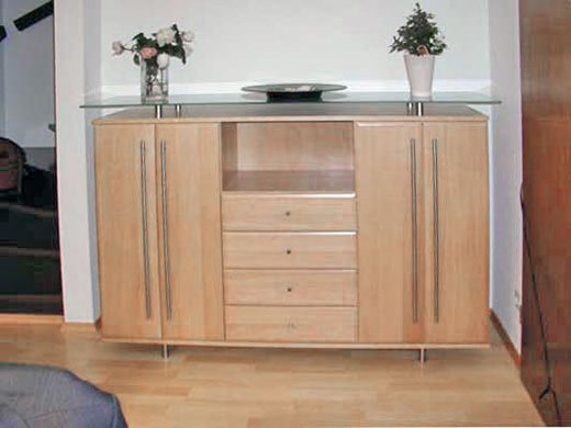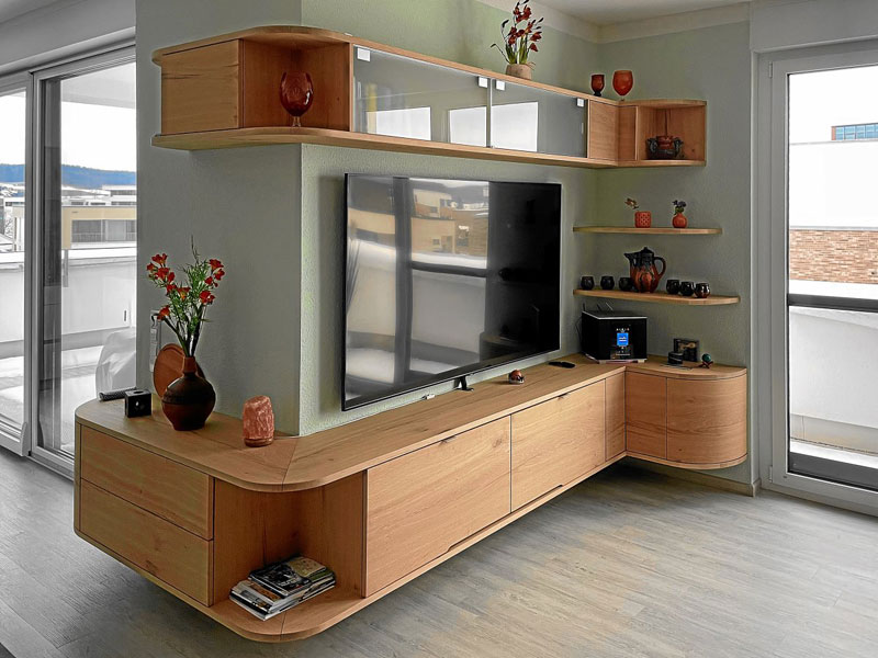 - Schränke und Regale im Wohnzimmer gefertigt, Oberfläche mit Rohholzeffektlack, Ecktüren formverleimt (rund)