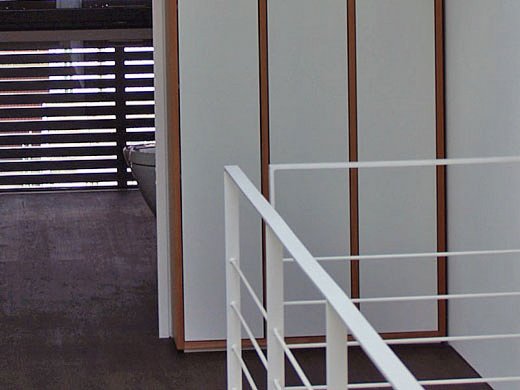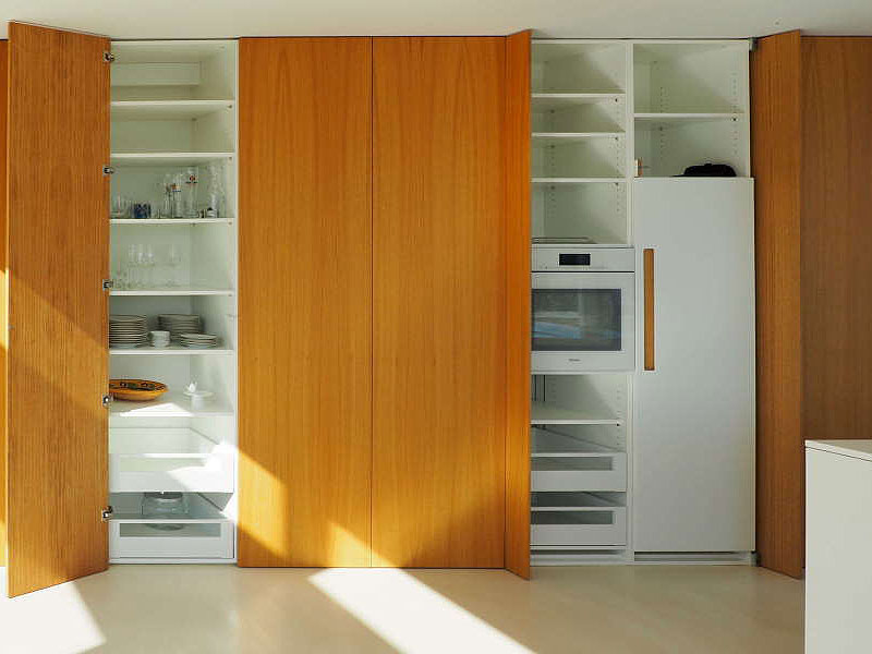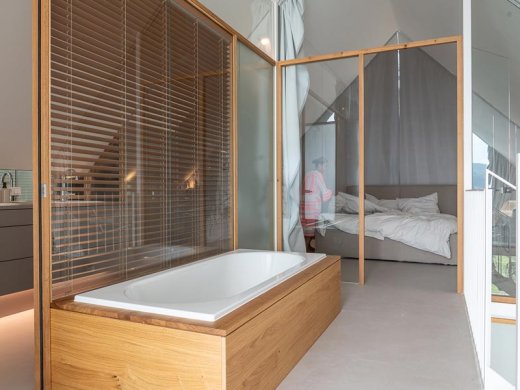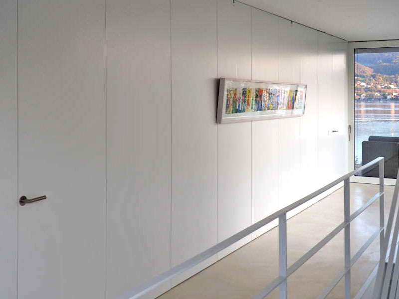 - Wandverschalungen aus Eiche und Weißlack mit integrierten Zimmertüren