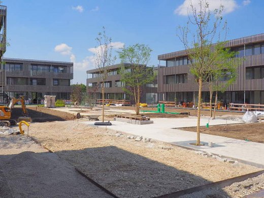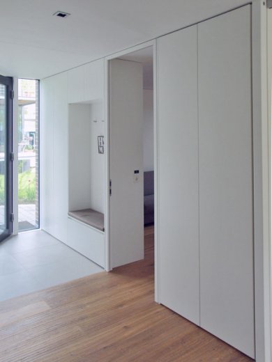 Für diese Wohnanlage fertigten und montierten wir 172 geschoßhohe Innentüren, teils als Schiebetüren