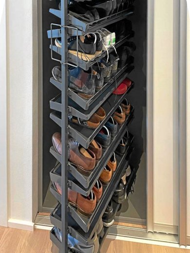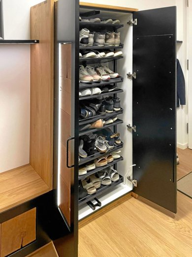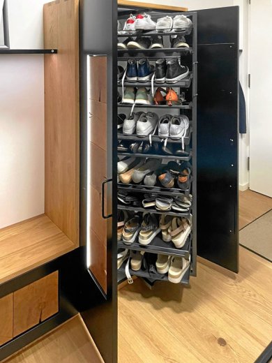 Um einen raumhohen Schrank ohne Leiter oder sonstige Steighilfen vollständig zu nutzen bieten sich Garderobenlifte an, diese gibt es in verschiedenen Ausführungen, wir beraten sie gerne.